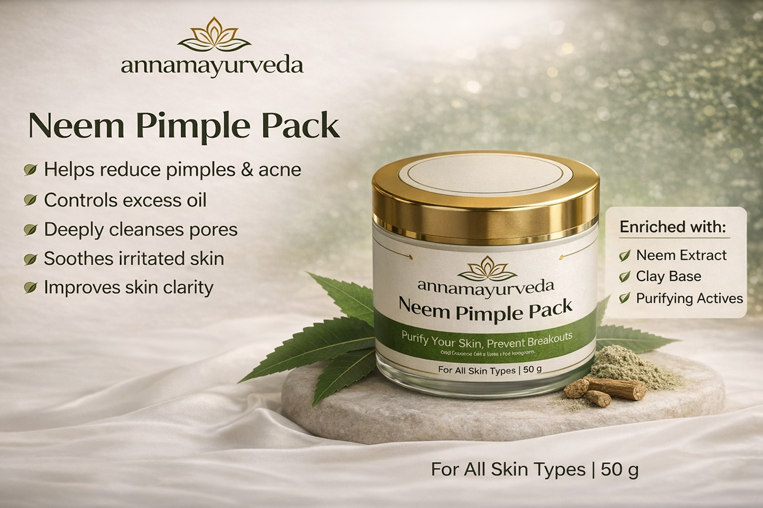 Neem Pimple Pack is an effective Ayurvedic solution for acne-prone skin. Enriched with Neem Extract and purifying actives, it helps control excess oil, remove impurities, and reduce pimples.
